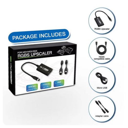 The MD1/MD2/SNK RGBS UPSCALER converts the analog RGBS signal of the MD1/MD2/SNK game consoles into 1080P digital HDMI signal with audio/video lossless on modern HD TV's , monitors and projectors.